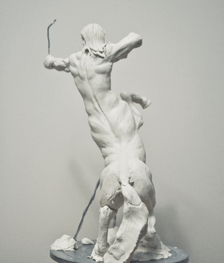 An anatomical study of a centaur rearing while drawing his bow. Reference material was used in an attempt to replicate realistic equine and human anatomy.
