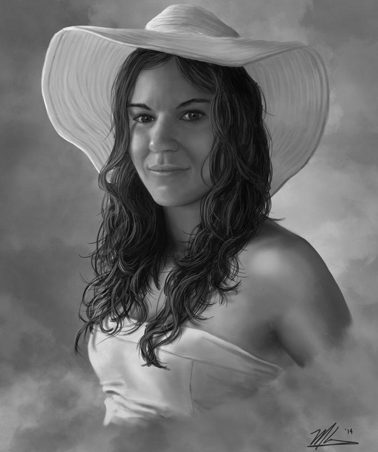 A portrait of a girl wearing a sun hat. The image was drawn from a reference photograph using a graphics tablet. Special attention was given to capturing the likeliness of the subject. |